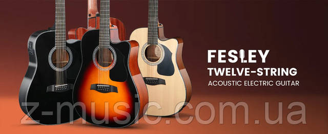Нова електро-акустична повнорозмірна 12-тиструнна гітара, бренду з США, для американського ринку, вже в Україні, Fesley, модель FDET280C BK.